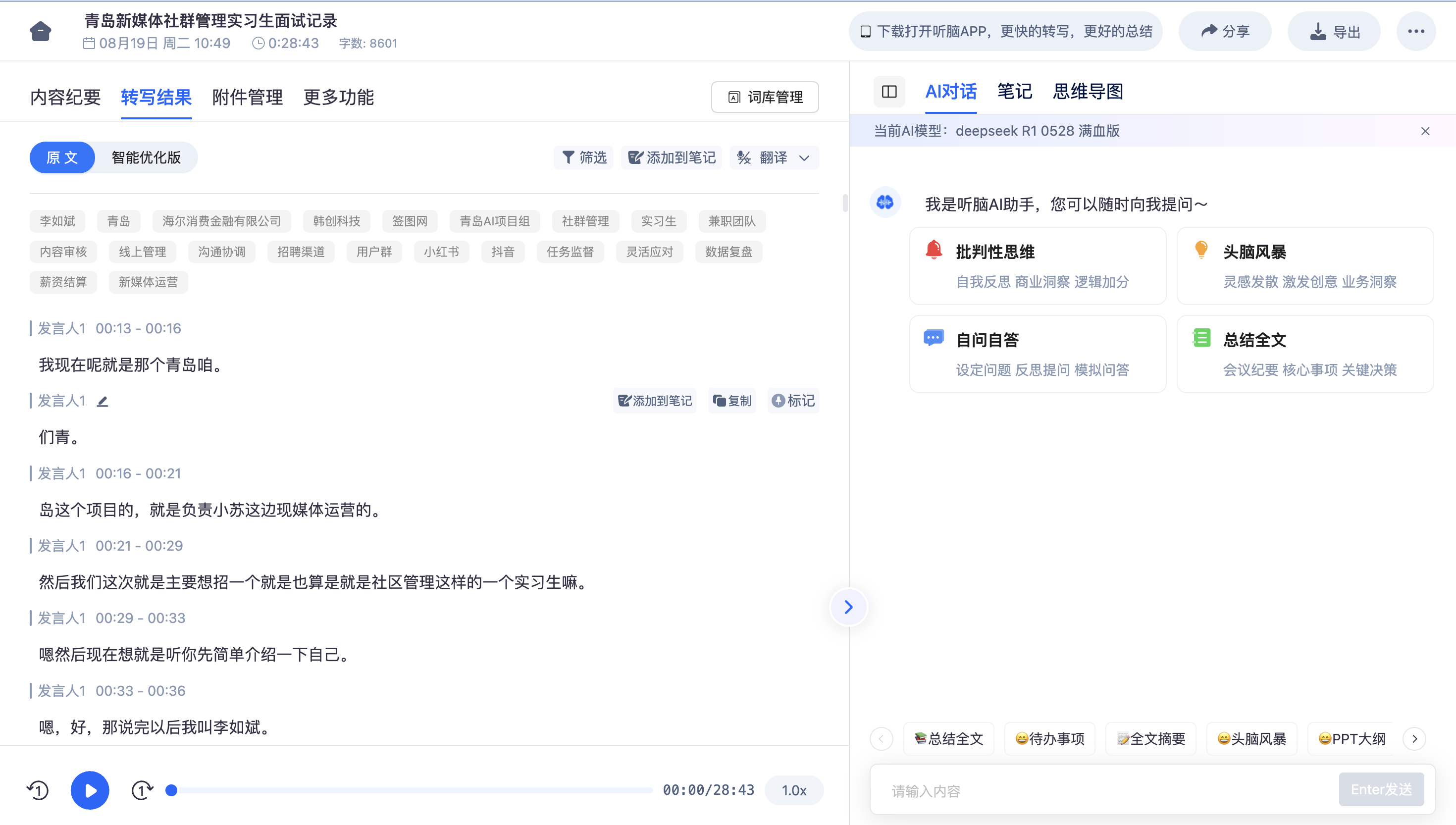按照现实需求选。公司制做播客。手艺扩展性10%。特地研究智能语音转写手艺评测。网易见外82.1分。处置效率20%。能及时优化转写逻辑。专业术语识别率98.7%。听脑AI有32%。笼盖42种言语。但中文方言仅支撑粤语。处置速度每分钟10秒。功能适配性看具体功能。好比会议纪要模板!